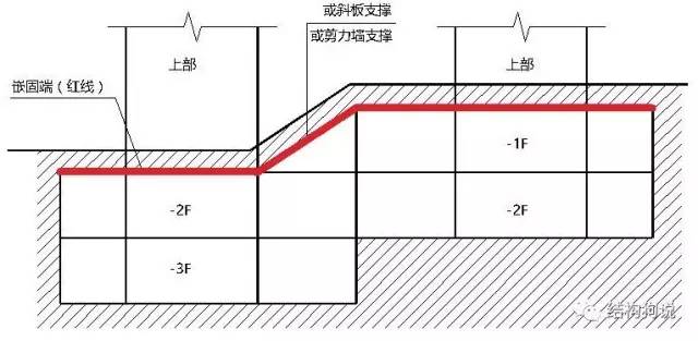 对于有地下室的情况,在高差交接部位需要设置斜板支撑或设置垂直向的剪力墙,保证地震力可靠传递。建筑高度可按分台后的嵌固端分别计算。交接处应有一定的重叠部位保证此处的刚度。